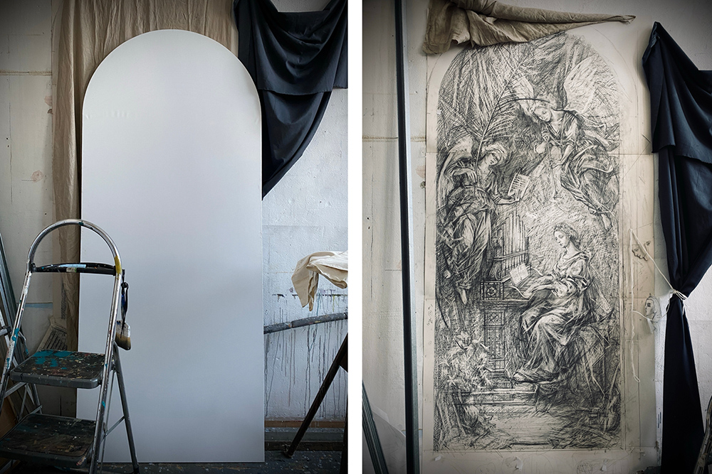 Лина Городецкая: Образ святой Цецилии и в этот раз мы решили доверить таланту Евгении Шадриной-Шестаковой. Она чудесным образом для нас понимает ситуацию, историю и место. Объяснить это сложно. Образ, как и в случае со Святейшим Сердцем, это не копия, не реплика. Это самостоятельная история, которая оживает на холсте. И, поскольку эта история – живая, то какой образ будет в итоге, мы не знаем с точностью и в деталях. Будет святая Цецилия, будет орган и будут ангелы. Изучая иконографию святой Цецилии, мы знаем, что пальмовая ветвь – знак её мученичества, цветы, по которым можно узнать образ святой – розы и лилии. Несомненно, на холсте будет отсылка к Диего Сера (1762-1832) – испанскому монаху августинцу, который служил на Филиппинах и построил там бамбуковый орган. Этот орган служит до сих пор и на нём проводится единственный в мире фестиваль на бамбуковом органе. Именем этого монаха названа органостроительная фирма, которая построила и наш новосибирский орган. Вторая отсылка – это честь упомянуть на полотне отца Иоханнеса Труммера – священника и органиста, который с особой щедростью помогал студентам со всего мира освоить мастерство игры на органе и даже строить органы. Многие органисты в России, проходившие обучение в Граце, до сих пор вспоминают его заботу.