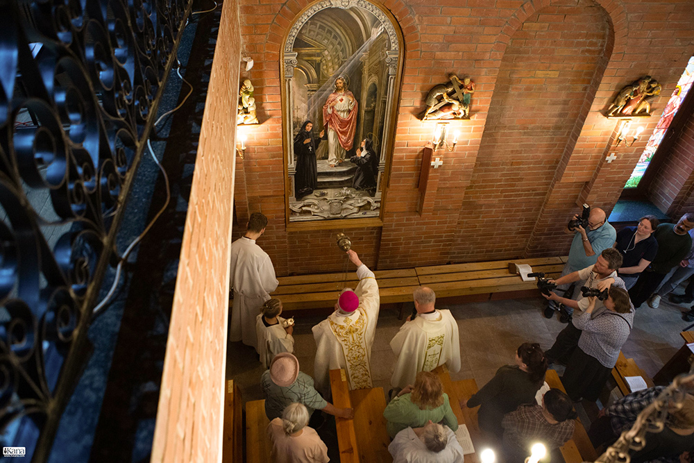 Освящение храмового образа Святейшего Сердца Иисуса в Новосибирске, 1 июня 2025 года. Образ святой Цецилии будет располагаться в нише справа от него. Фото: ТВ Кана