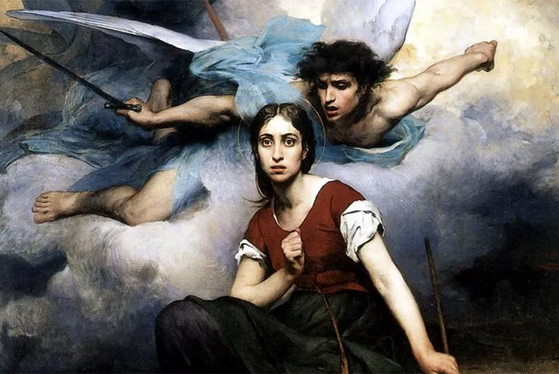 Ей было всего 12 или 13 лет, когда она впервые увидела его в саду своего отца. С ним были ангелы рая, святая Екатерина и святая Маргарита, призывавшие её быть «хорошей и благочестивой девочкой», соблюдать «волю Божию» и стремиться к спасению своей души. Представившись как «Михаил, покровитель Франции», он поручил Жанне миссию, которая превзошла её возраст и положение. Эти явления, повторявшиеся во время Столетней войны, придавали ей мужества и вдохновили на создание её знамени — с именами Иисуса и Марии — под которым она сражалась, что привело к снятию осады с Орлеана и коронации Карла VII в Реймсе в 1429 году.