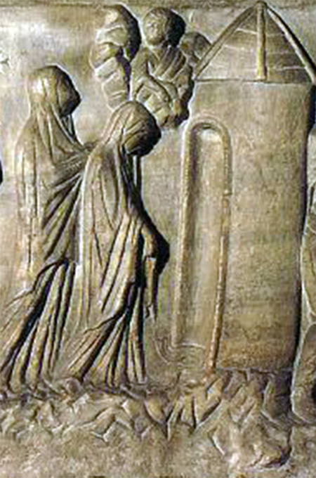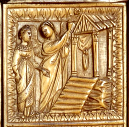 Изображение на панели деревянных дверей базилики Санта Сабина в Риме (432 г.) представляет гробницу в виде темпьетто. Вход в храм оформлен аркой, поддерживаемой колоннами. Ангел с крыльями, стоящий у входа в гробницу, провозглашает Воскресение двум Мариям.