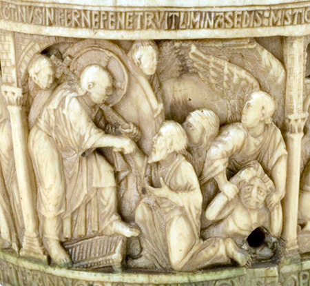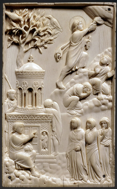 Уникальность этого рельефа заключается в том, что сцена Воскресения совмещается со сценой Вознесения Спасителя [20]. В верхней части пластины изображен юный Христос с нимбом и свитком в руке, поднимающийся вверх по скале (или облакам). Бог Отец берет Иисуса за руку и увлекает Его за Собой на небеса. Эта сцена иллюстрирует тот текст Деяний святых Апостолов, где о Воскресении и о Вознесении Иисуса говорится так: «Сего Иисуса Бог воскресил, чему мы все свидетели. Итак, Он быв вознесен десницею Божиею и приняв от Отца обетование Святого Духа, излил то, что вы ныне видите и слышите» (Деян. 2: 32 –33).