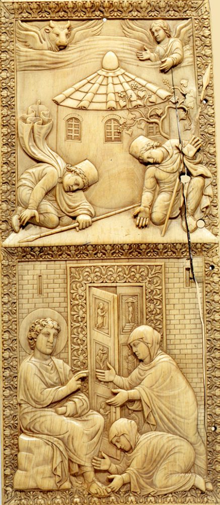 Панель диптиха начала V века из коллекции Тривульцио (Музей декоративного искусства Кастелло Сфорцеско, Милан) разделена на две части. В верхней части на рельефе представлены охваченные ужасом стражники (Мф. 28: 4). Внизу, перед приоткрытыми дверями гробницы, изображены две Марии. В смятении жены-мироносицы преклоняют колени и протягивают руки к сидящему на камне Ангелу, который обращается к женщинам с речью (Мф. 28: 5 – 6).