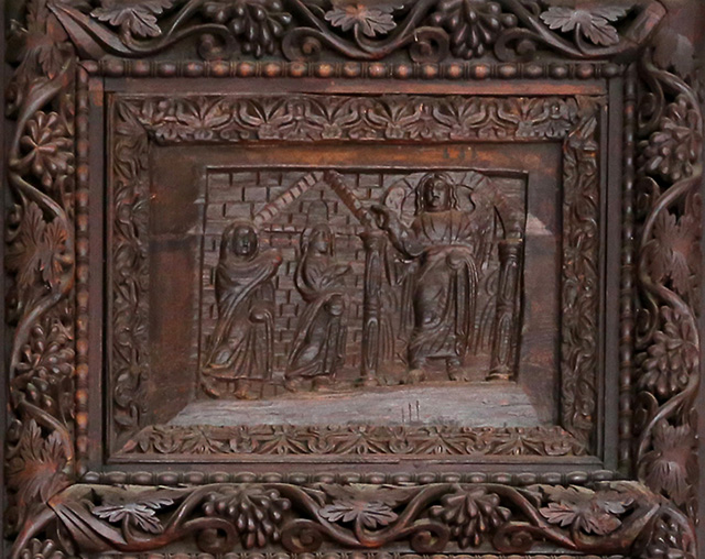 На рельефе гробница представлена в виде прямоугольного в плане темпьетто, увенчанного барабаном с прорезанными в нем арочными окнами. Перед этим храмом, символизирующем Гроб Господень, сидит на камне Ангел. Посланник Господа возвещает трем женщинам о чуде Воскресения. О том, что он обращается к женам-мироносицам с речью, свидетельствует жест его вытянутой руки с двумя выпрямленными пальцами [19]. Два стражника спят, облокотившись на стену гробницы. Над храмом возвышается дерево, плоды которого клюют птицы. Это дерево с раскидистой кроной символизирует райское Древо Жизни, а соответственно и Крест Христов. Как в византийской, так и в латинской традиции райское Древо Жизни типологически соотносится с древом Креста, ибо древом Креста Христова человечество возрождается к вечной жизни. Христос, умирая на кресте, побеждает смерть и дарует жизнь. Поэтому Крест есть знамение жизни. А, следовательно, Крест Христов есть видимое Древо Жизни. Согласно тексту Писания, Господь «побеждающему [даст] вкушать от древа жизни, которое посреди рая Божия» (Откр. 2: 7).