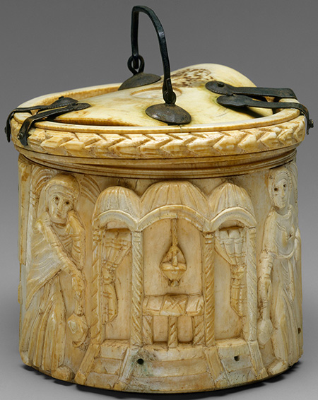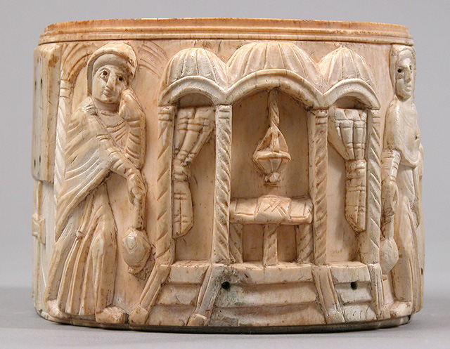 Особый акцент на эсхатологическом и спасительном значении Воскресения Христова сделан в рельефе дарохранительницы начала VI века византийского происхождения (Метрополитен-Музей, Нью-Йорк). В гробницу, которая своими формами напоминает киворий, ведет лестница. По сторонам от Гроба Господня стоят жены-мироносицы с сосудами для благовоний или кадилами в руках. Внутри кивория, за раздвинутыми завесами, располагается алтарь с висящим над ним кадилом. Этот алтарь является символом искупительной жертвы Христа.