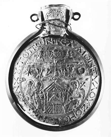 Подобная композиция была очень распространена в изображениях, выполненных в технике чеканки на небольших серебряных и свинцовых сосудах для хранения святого масла, которые изготавливались в Палестине в VI веке. Эти ампулы паломники увозили с собой из святых мест, и они распространялись по всем странам христианского мира. Самые известные ампулы хранятся в сокровищницах соборов в Монце и Боббио (Италия). Об основных сюжетах и композициях, которые использовались в оформлении стенок ампул, можно судить по рисункам, сделанным в XIX веке итальянским археологом Раффаэле Гарруччи (Raffaele Garrucci) [21]. Сцена Воскресения Христова иллюстрируется на этих ампулах событием посещения женами-мироносицами Гроба Господня, который изображается в виде часовни с алтарем. Как правило, в этих сценах присутствует Ангел, который сообщает женщинам о Воскресении Господа.