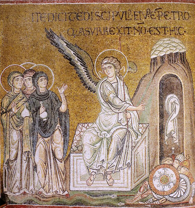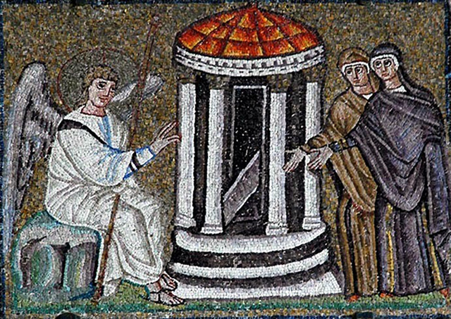 Центром мозаичной композиции начала VI века «Жены-мироносицы у Гроба Господня» базилики Сант Аполлинаре Нуово в Равенне является ротонда с белыми колоннами коринфского ордера. Снятая крышка саркофага свидетельствует об уже свершившемся Воскресении, о чем благовествует сидящий на камне возле гробницы Ангел в белых одеждах с жезлом в руке.