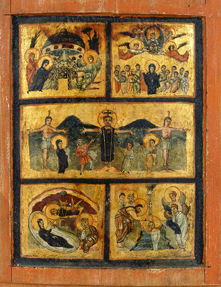 Этот многогранный и сложный по своей сути образ Anastasis требует внимательного и последовательного прочтения. Центральная часть строго симметричной композиции – крест, увенчанный хризмой [6]. Крест Христов представлен как центр и ось всего мироздания. Смерть и Воскресение Сына Божия воспринимается как главное событие мировой истории, дающее вечную жизнь всему человечеству.
