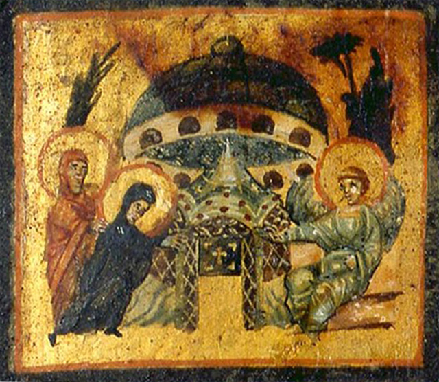 Древнейшим, дошедшим до нашего времени памятником, изображающим посещение Гроба Господня женами-мироносицами, является роспись III века из баптистерия дома собраний в Дура-Европос [14] (Жены-мироносицы у Гроба Господня. 233–256 гг. Роспись. Баптистерий дома собраний в Дура-Европос. Художественная галерея Йельского университета).