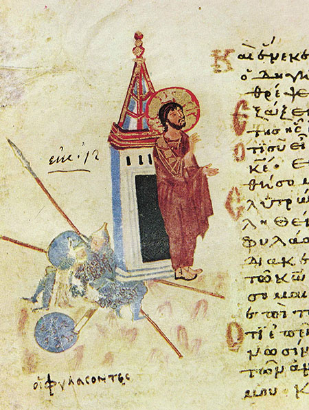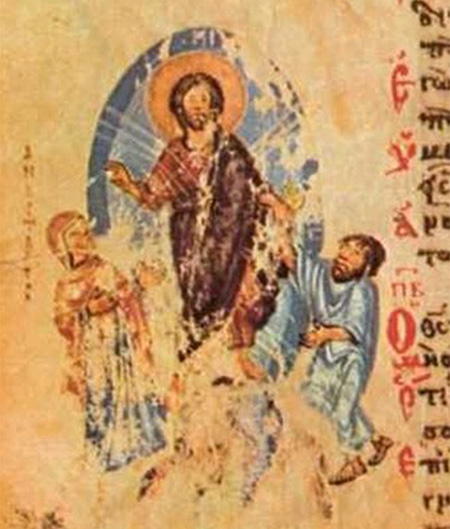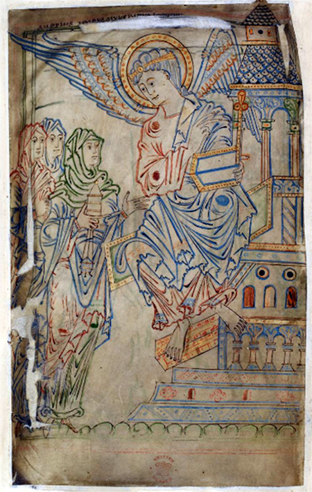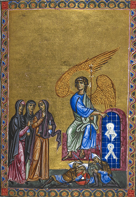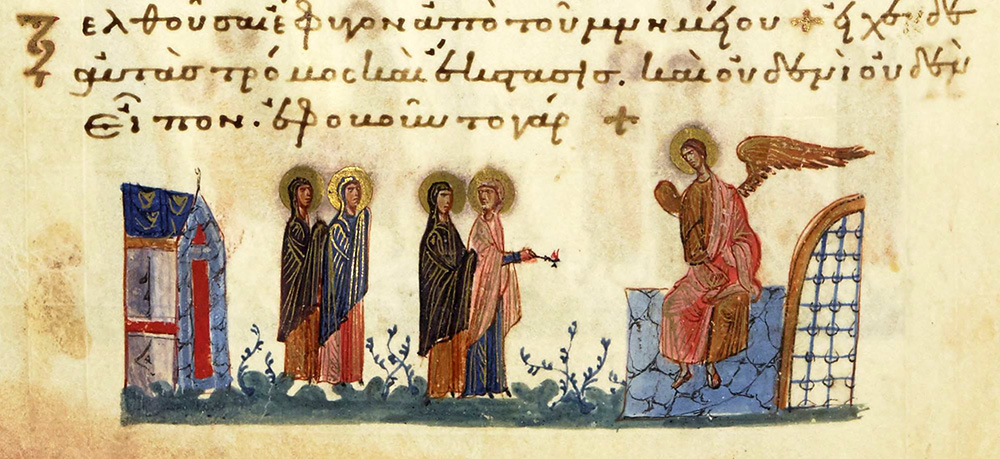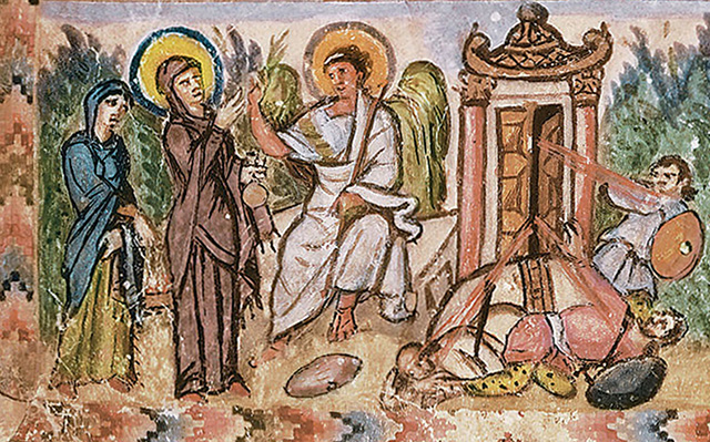 В знаменитом сирийском иллюстрированном манускрипте VI века «Евангелие Рабулы» (Библиотека Лауренциана, Флоренция) изображенная сцена благовестия женам-мироносицам отличается особой экспрессией и выразительностью. Из полуоткрытых дверей ротонды, с необычным по форме перекрытием, пробиваются лучи света, которые сами по себе свидетельствуют о событии чрезвычайном. Пораженные этими лучами, стражники в панике разбегаются и падают на землю.