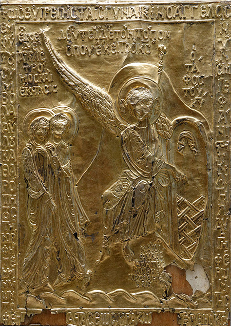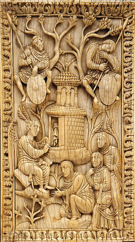 На окладе Евангелия V века из сокровищницы собора Дуомо в Милане Гроб Господень представлен в виде сооружения с фронтоном и колоннами. К зданию ведет лестница, символизирующая восхождение. Простая по своей незатейливости композиция кажется обычной житейской сценкой. Ангел, обращаясь к Марии Магдалине, указывает правой рукой на небеса, а Мария от удивления разводит руками. Звезда, сияющая над Гробом Господнем, обозначает раннее утро – то время, когда Мария Магдалина пришла ко Гробу (Ин. 20: 1).