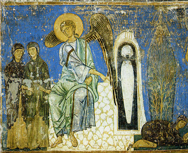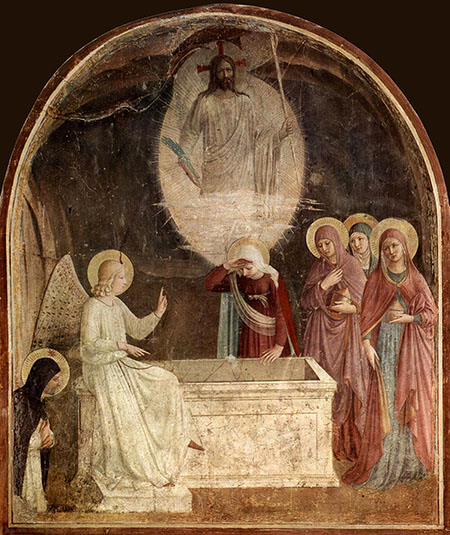 На фреске Фра Беато Анджелико (1395–1455) из монастыря Сан Марко во Флоренции (Фра Беато Анджелико. Воскресение Христа. 1441. Фреска. Монастырь Сан Марко, Флоренция) Христос в сияющей мандорле, со знаменем победы и пальмовой ветвью в руках, парит в небесах. Но Он оказывается невидим для окружающих. Жены-мироносицы, собравшиеся у пустого Гроба слушают Ангела, но не видят Воскресшего.