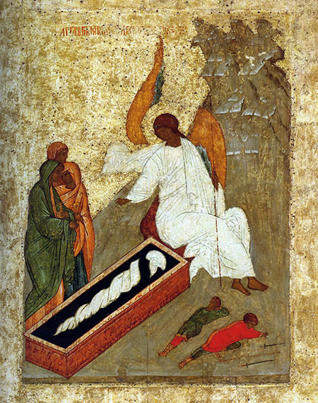 Ангел в белых одеяниях, с жезлом в левой руке, жестом правой вытянутой руки указывает трем женам-мироносицам на пустой гроб с пеленами. Погребальные пелены в гробу, изображенные замотанными в том виде, как они облекали тело, – указание на свершившееся чудо (Ин. 20: 6–7). Пелены потеряли возможность держать в себе преображенную плоть Христа, шагнувшего из гроба в «воскресение жизни» (Ин. 5: 29). Иными словами, тело, заключавшееся в этих пеленах, непостижимым образом эти пелены покинуло. «В противоположность Лазарю, – как пишет митрополит Сергий, – [воскресшая плоть Христа] свободно вышла из гроба и из пелен, даже не затрагивая их; все это потеряло силу удерживать Воскресшего, принадлежащего уже другому миру» [24].