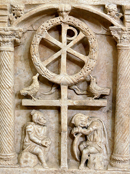 Монограмма Христа вписана в лавровый венок, который является знаком победы [7]. Лавровый венок с монограммой Христа, по сути, составляет эмблему Воскресения. Птицы, клюющие плоды венка, – образы душ праведных, вкушающих райские блаженства [8]. Это есть указание на изобилие жизни, являющейся следствием искупительной жертвы Христа. В некоторых композициях Anastasis встречается изображение орла с распластанными крыльями, который держит в клюве венок. Древний символ победы – орел [9] – в раннехристианском искусстве приобрел значение торжества над смертью и обновления [10]: «обновляется, подобно орлу, юность твоя» (Пс. 102: 5). Под крестом сидят бездвижно, опершись на щиты, два стражника, погруженные то ли в сон, то ли в забытье. Согласно тексту Евангелия от Матфея, «стерегущие пришли в трепет и стали, как мертвые» (Мф. 28: 4). Эти две фигуры символическим образом указывают на Гроб Христов, который они призваны стеречь. На самом верху композиции, по сторонам от креста, – персонифицированные изображения Солнца и Луны. Здесь мы имеем дело с эсхатологическим изображением природы, что согласуется со словами пророка Иоиля: «солнце превратится во тьму и луна – в кровь, прежде нежели наступит день Господень, великий и страшный» (Иол. 2: 31). Аналогичное предсказание звучит и в Откровении Иоанна: «солнце стало мрачно как власяница, и луна сделалась как кровь» (Откр. 6: 12). Таким образом, в очень лаконичном, но содержательном по своей сути образе соединены три главных события из жизни Богочеловека: страдание (крест), смерть (гроб, на который указывают стерегущие стражники) и воскресение (триумфальный венок, как символ победы над смертью).