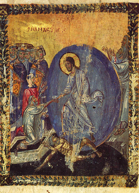 История искусств не знает ни одного памятника более раннего Хлудовской Псалтири, где бы был изображен Христос, восстающий из Гроба. Но подобные изображения встречаются в византийских рукописях IX–XI века: в Псалтири IX века монастыря Пантократор (Воскресение Христа. Миниатюра. IX век. Псалтирь Пантократора. Athos, Pantokr. 61. Монастырь Пантократор, Афон, Греция; Царь Давид предсказывает воскресение Христа. Миниатюра. Псалтырь Пантократора. IX век. Афон, Греция), в Псалтири Барберини XI века (Воскресение Христа. Миниатюра. Псалтирь Барберини. XI век. Barb.gr. 372, f. 49v. Апостольская библиотека Ватикана), в Псалтири Теодора XI века (Воскресение Христово. Миниатюра. Псалтирь Теодора. Ms 19352. Константинополь. XI век. Британская библиотека, Лондон).