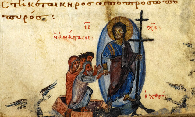 Однако некоторые исследователи сходятся во мнении, что этот образ восстающего из гроба Христа имеет византийские корни [55]. В уже упомянутом ранее знаменитом константинопольском манускрипте IX века – Хлудовской Псалтири – есть иллюстрации с изображением Христа, поднимающегося со Своего погребального ложа, и Христа, стоящего рядом с Гробом.