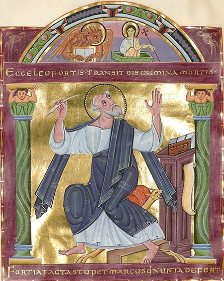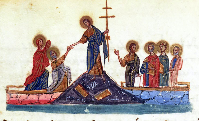 Считается, что первые изображения Христа, выходящего из Гроба, появились в иллюминированных рукописях Германии в X веке [53]. В качестве одного из самых ранних примеров подобного сюжета называют иллюстрацию Бамбергского Евангелия (Бамбергское Евангелие. 1010 г. BSB Clm 4454, f. 86 v. Баварская государственная библиотека, Мюнхен) [54]. На листе с изображением евангелиста Марка в самой верхней части представлен образ Христа, поднимающегося из Гроба. В левой руке Иисус держит крест, а правую поднимает в жесте «говорения». Рядом – лев, символ евангелиста Марка. Надпись внизу гласит: «Вот лев сильный переступает через порог смерти» (Esse leo fortis, transit dis crimina mortis).