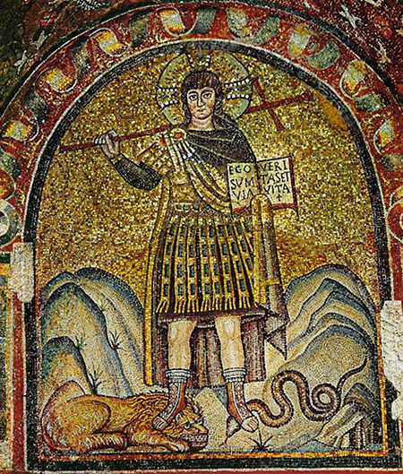 Христос в мозаике из Архиепископской капеллы Равенны (конец V – начало VI века) представлен в облике юного императора-победителя на золотом фоне. Он облачен в воинские доспехи римского военачальника и плащ-палудаментум пурпурного цвета, который закреплен на плече фибулой, украшенной драгоценными камнями. В правой руке Иисус держит триумфальный крест – орудие победы над смертью, а в левой – книгу с начертанными словами: «Я есмь путь и истина и жизнь» (Ин. 14:6) (Ego sum via, veritas et vita). Ногами Спаситель попирает змею и льва – символы зла, греха и смерти. Афанасий Великий (295–373) образно сравнивает смерть со змеей и со львом и говорит о том, что смерть повержена Крестом: «А что смерть сокрушена, что крест соделался победою над нею, что она не имеет уже более силы, но действительно мертва, сему немаловажным признаком и ясным удостоверением служит то, что пренебрегается она всеми учениками Христовыми, все наступают на нее и не боятся ее, но крестным знамением и верою во Христа попирают ее как мертвую. Кто видит попираемую змею, тот (особливо если знал прежнюю ее свирепость) не сомневается уже, что змея мертва и совершенно изнемогла […] Кто видя, что дети играют со львом, не познает из этого, что лев мертв или потерял всю свою силу? Как в истине этого можно увериться своими глазами: так, поелику верующие во Христа посмеиваются над смертью и пренебрегают ею, то никто да не сомневается более, никто да не остается в неверии, что смерть упразднена Христом, и разрушительность ее уничтожена и прекращена» [13].