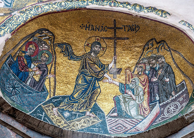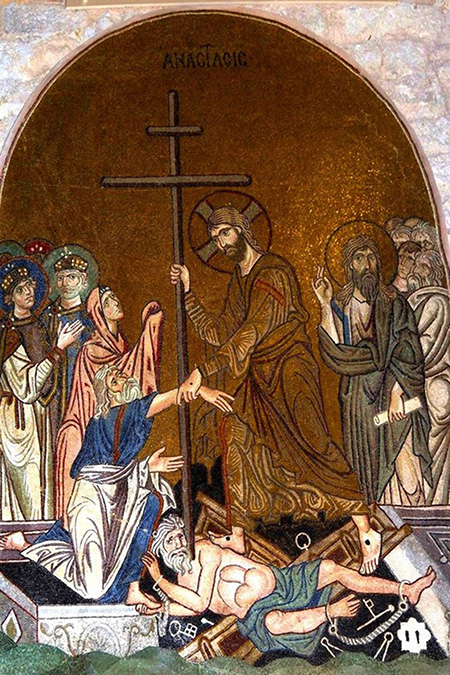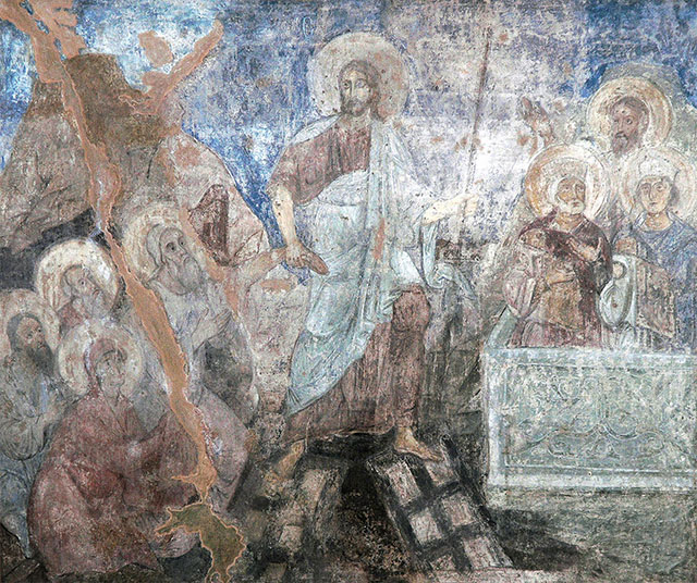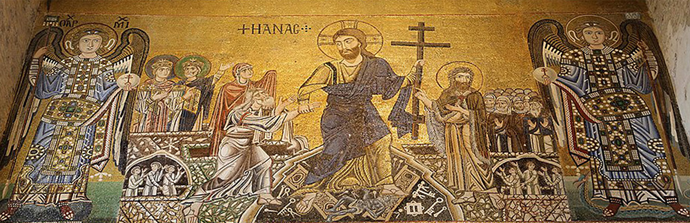 Космическим размахом поражает воображение фреска «Сошествие во ад» церкви Христа Спасителя константинопольского монастыря Хора (Сошествие во ад. XIV век. Фреска. Монастырь Хора, Константинополь). Композиция этой росписи послужила образцом для многих памятников поздневизантийского и древнерусского искусства. Огромная фигура Христа в белоснежных одеждах выделяется ярким пятном на темно-синем фоне. Триумфальность Спасителя подчеркивается не только сияющей мандорлой, но и фронтальным изображением Его фигуры. Спаситель устремляет взгляд на зрителя и при этом победоносным жестом берет за руки Адама и Еву, которые расположены по сторонам от Него. Ощущение динамичности усиливается изломанным силуэтом фигур прародителей, которые выбираются из своих саркофагов, увлекаемые Иисусом к свету.