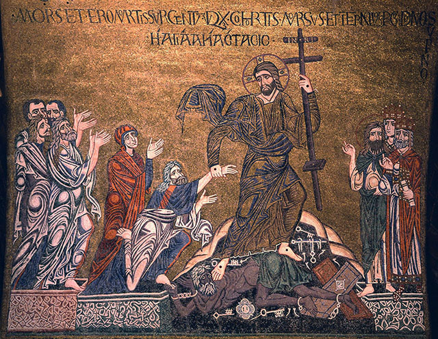 Согласно Евангелию Никодима, Ад пытается воспротивиться пришествию Царя славы, приказывая демонам «крепко и твердо заключить врата медные и запоры железные» [29]. На вопрос Ада «кто есть сей Царь славы», Ангелы отвечают: «Господь крепкий и сильный» [30]. «Тотчас, вместе с этим словом, медные врата сокрушились и железные запоры сломались, и все связанные мертвые разрешились от уз […] И вошел Царь славы, как человек, и все темницы ада просветились» [31]. Царь славы связывает руки и ноги Сатаны железными узами и передает его Аду со словами: «Держи его крепко до второго Моего пришествия» [32]. Далее «Царь славы простер десницу Свою и взял и воздвиг праотца Адама. Потом, обратясь к прочим, сказал: сюда – со Мною все, умерщвленные древом, к которому он прикоснулся, вот Я опять всех вас воскрешаю древом креста» [33].