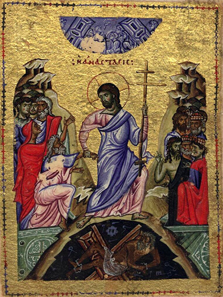 И все же провозглашающая Воскресение иконография «Жены-мироносицы у Гроба Господня» не могла в полной мере отразить богословское содержание одного из самых главных событий христианского вероучения. Символико-догматический смысл Воскресения Спасителя нашел свое воплощение в иконографии «Сошествие Христа во ад». Событие, произошедшее во второй день пребывания Христа во Гробе, предваряющее Воскресение Христово, становится пасхальным символом именно потому, что выступает как образ наступающего торжества всеобщего воскресения [25]. Сойдя в ад, Христос побеждает смерть, освобождает Адама, а вместе с ним и все человечество от греха и смерти: «Как в Адаме все умирают, так во Христе все оживут» (1 Кор. 15: 22). Известный русский исследователь византийского искусства В. Н. Лазарев отмечает, что византийцы трактовали Сошествие во ад как Воскресение [26]. Именно победа Христа над смертью и совершаемое им воскрешение пленников ада определяют догматический смысл праздника Пасхи. Богословская по своей сути композиция Сошествие во ад, раскрывающая идею освобождения Христом находящегося в царстве смерти человечества, получила название Анастасис (греч. Άνάστασις – Воскресение). «Сошествие Христа во ад» стало одним из главных, канонических образов Пасхи восточной христианской Церкви, обязательным элементом Страстного цикла храмовых росписей [27].