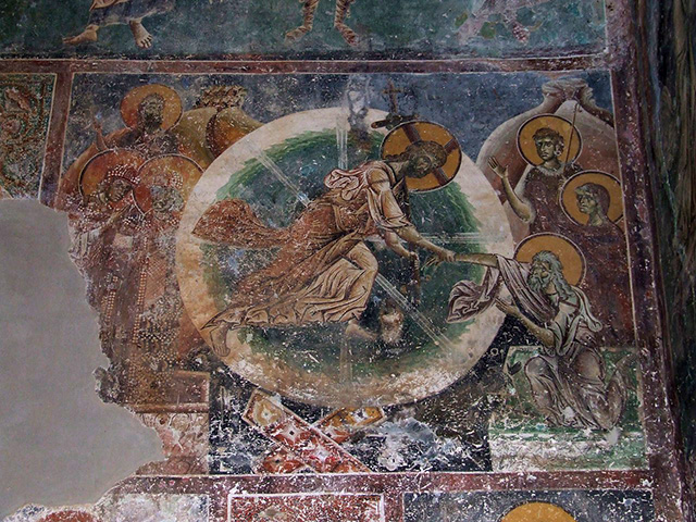 Постепенно композиции становятся более динамичными и экспрессивными. На фреске из церкви Святого Георгия в Курбиново (Сошествие во ад. XII век. Фреска. Церковь Святого Георгия, Курбиново, Македония) Христос изображен в круглом ореоле света с расходящимися в разные стороны лучами. Спаситель делает широкий шаг и при этом в порывистом движении устремляется к Адаму, хватая его за руку.