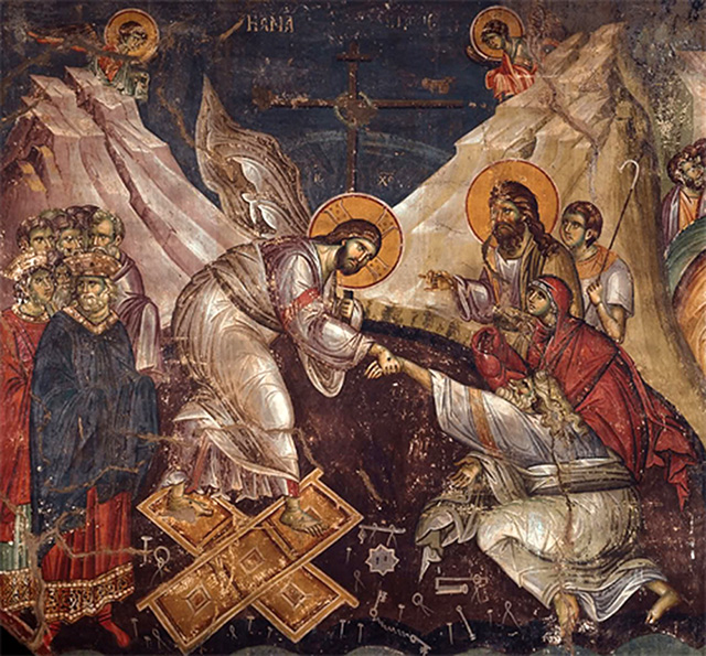 Христос воззвал Адама из тьмы, в которую он был погружен, и сказал: „Где ты, прекрасный Адам, обольщенный некогда советом жены?