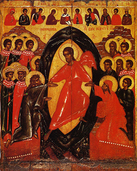 Изображенный на золотом фоне Христос с крестом в руке триумфально возвышается над пропастью ада, во мраке которого лежит связанный Сатана в образе седого, косматого старика. Спаситель выводит за руку Адама, поднимающегося из саркофага. Рядом с Адамом стоит Ева в красном одеянии, за ней – группа праведников. С другой стороны от Христа – Иоанн Предтеча с ветхозаветными царями. Композиция симметрично обрамляется изображением двух гор, которые символически указывают на то, что действие разворачивается в преисподней [49]. А на самом верху, в полукруге художник изобразил Царствие небесное с открытыми вратами, голубыми небесами и Ангелами с крестами в руках.