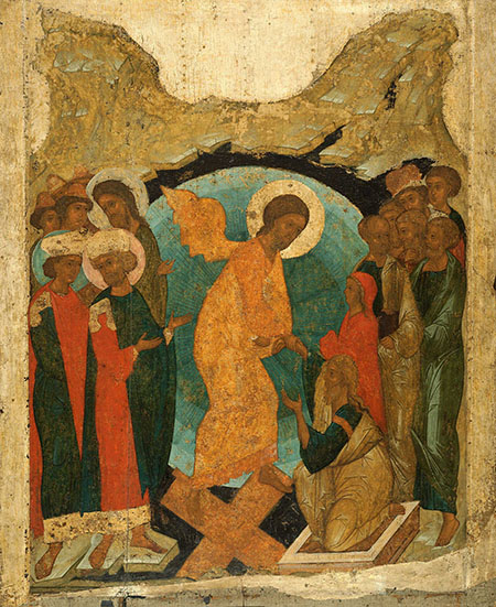 Сцены «Сошествия во ад», изображенные на древнерусских иконах XIV – XVI века, представляют собой прекрасный образец богословской трактовки события Воскресения. (Сошествие во ад. XIV век. Икона. Псков. Государственный Русский музей, Санкт-Петербург; Сошествие во ад. 1408. Икона. Государственная Третьяковская галерея, Москва).