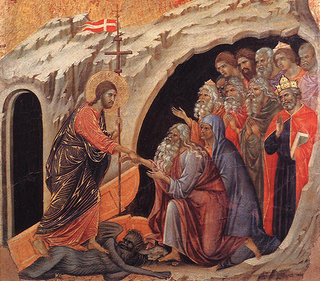 Одним из первых итальянских художников, кто внес в каноническую византийскую схему психологическую составляющую и определенный реалистический элемент был Дуччо ди Буонинсенья (1255–1319) – художник Проторенессанса, видный представитель сиенской школы живописи (Дуччо. Сошествие в ад. Часть алтарной картины Маэста. 1308–1311. Дерево, темпера. Музей дель Дуомо, Сиена). В композиции Дуччо, едва ли не впервые, Христос с крестом в руках смещается от центра в сторону. Тем самым подчеркивается драматизм происходящего события, поскольку акцент переносится с фигуры Спасителя на тот диалог, который разворачивается между Христом и праведниками, собравшимися у выхода из ада. В этом прослеживается тенденция отказа от теоцентричности и переход к антропоцентризму.