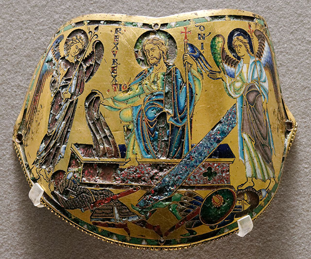 Изображение Христа, выходящего из гроба со знаменем победы – крестом-флагом в руке, представлено на медной позолоченной накладке, так называемом наплечнике Андрея Боголюбского (1170–1180 гг. Медь, золочение, эмаль. Лувр, Париж) [57]. Эмалевая миниатюра XII века, выполненная лотарингскими мастерами, изображает Христа, который порывистым движение руки скидывает с себя погребальные пелены и переступает ногой через край саркофага. Крышка с саркофага сброшена. Стражники в воинских доспехах повержены на землю. Два ангела по сторонам от Христа с жезлами в руках символизируют Его небесное воинство. Они с благоговением взирают на воскресшего Спасителя и жестом поднятых рук с раскрытой ладонью удостоверяют произошедшее чудо.
