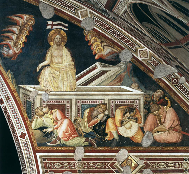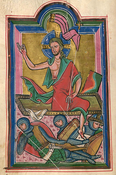 Но уже Пьтро Лоренцетти (1280–1348) на стене нижней церкви базилики святого Франциска в Ассизи изображает Христа, выходящим из Гроба (Пьетро Лоренцетти. Воскресение Христа. 1310–1319. Фреска. Нижняя церковь базилики Святого Франциска, Ассизи). Эта композиция очень близка миниатюре из Магдебургской Псалтири.