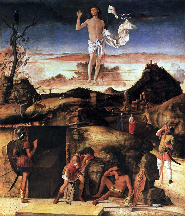 Парящий над гробом Христос изображен на полотне венецианского живописца Джованни Беллини (1430–1516) (Джованни Беллини. Воскресение Христа. 1475–1479. Дерево, масло. Берлинская картинная галерея, Берлин) и на фреске художника умбрийской школы живописи Пинтуриккьо (1454–1513) (Пинтуриккьо. Воскресение Христа. 1492–1494 гг. Фреска. Апартаменты Борджиа. Апостольский дворец, Ватикан). Картина Джованни Беллини отличается большим количеством персонажей (четыре стражника, жены-мироносицы, фигуры крестьян) и вниманием к деталям окружающего мира (виды городка на заднем плане). Таким же изобилием подробностей характеризуется и произведение Пинтуриккьо. В его композиции Воскресения присутствует даже изображение заказчика росписи – Папы римского Александра VI (Родриго де Борджиа).
