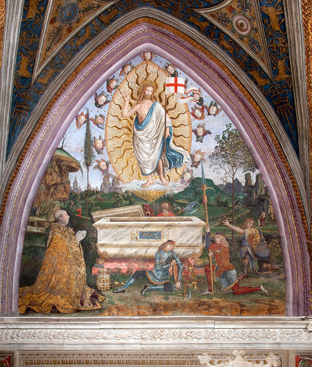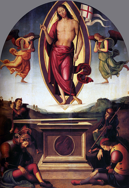 Особенно хотелось бы выделить две работы с изображением Воскресения Христова другого итальянского мастера эпохи Возрождения – Перуджино (1448–1523). Речь идет о картине из Пинакотеки Ватикана (Перуджино. Воскресение Христово. 1499. Дерево, масло. Пинакотека Ватикана) и о части алтарной картины, предназначенной для аббатства Святого Петра в Перудже (Перуджино. Воскресение Христа. Часть полиптиха. 1496–1500. Дерево, масло. Музей изящных искусств, Руан).