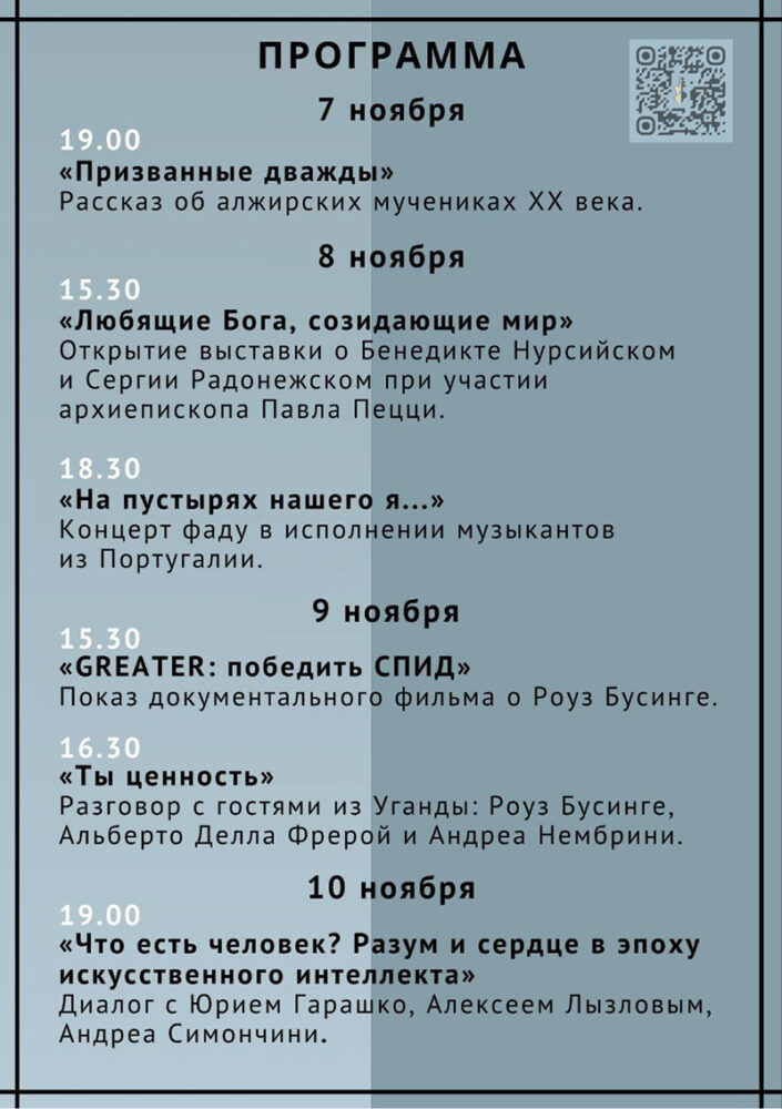 В программе — выставка о святых Сергии Радонежском и Бенедикте Нурсийском; встреча с медсестрой из Уганды, которая помогает женщинам с тяжелым диагнозом находить смысл и радость в жизни; свидетельство миссионеров, убитых исламистами в Алжире в конце ХХ века и недавно канонизированных Церковью; беседа о человечности в эпоху ИИ, а также концерт фаду в исполнении португальских музыкантов.
