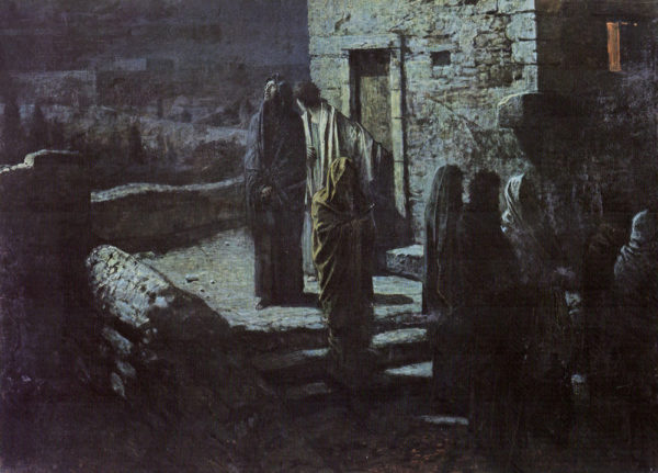 Для изображения художник избрал промежуточный момент в евангельской истории ‒ между уже состоявшейся Тайной вечерей и последующими событиями в Гефсиманском саду. Как пишет искусствовед С. С. Степанова, художник нашел особую точку напряжения [29]. Это еще не сама трагедия, а ее предчувствие, когда, как отметил сам Ге, «Христос почувствовал начало агонии» [30]. Застыла на верхней площадке лестницы озаренная лунным светом фигура Христа, устремившего свой взор в ночное небо. Спускаются вниз темные фигуры учеников. Их лиц невозможно разглядеть. Они проплывают словно тени, задумчиво опустив головы, бесшумно, не оглядываясь. Как ярко художнику удалось передать тему абсолютного одиночества, которая звучит особенно пронзительно в эскизе к картине (1888, Государственная Третьяковская галерея).