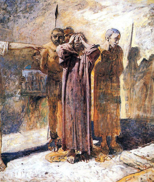 Жалкий, одинокий, потерянный, стоит Иуда, закутанный в плащ, на пустынной дороге и смотрит вслед пропадающим во тьме, едва заметным фигурам стражников, уводящих Того, Кого он предал. Какое прозорливое решение ‒ показать его со спины. На вид спокойный, но навсегда утративший спокойствие, разом потерявший все, чем жил, сам себя отрезавший навеки и осознающий весь ужас содеянного. «Иуда представляется мне первообразом предательства, ‒ так скажет Николай Ге. ‒ Старые, низшие потребности, плотские, делают бунт и восстают на человека. И вот, он по слабости уступает, ‒ вот и предательство. […] Я все хотел выразить его душу; понятно, что внешность не может представить никакого интереса. Понимал я, что нужно его увидать после совершения предательства. […] Я сделал так: Христа повели и ведут с факелами. Группа эта очень далеко и скоро исчезнет. На большом расстоянии идет тихо Иуда. […] И побежать не может, и бросить не может. Вот эта двойственность выражена в движении. […] Один выход такому мертвецу ‒ умереть. Он и умер» [39]. Если в картине «Тайная вечеря» образ Иуды, решительно и безвозвратно отрекающегося, вызывает неподдельный ужас, здесь этот несчастный, обрекший себя на позорную славу, проклятый всеми отныне и во веки веков, вызывает жалость и едва ли не сострадание. Ибо, как пронзительно напишет Леонид Андреев, «у всех народов, какие есть, какие были, останется он одиноким в жестокой участи своей ‒ Иуда из Кариота, Предатель» [40].